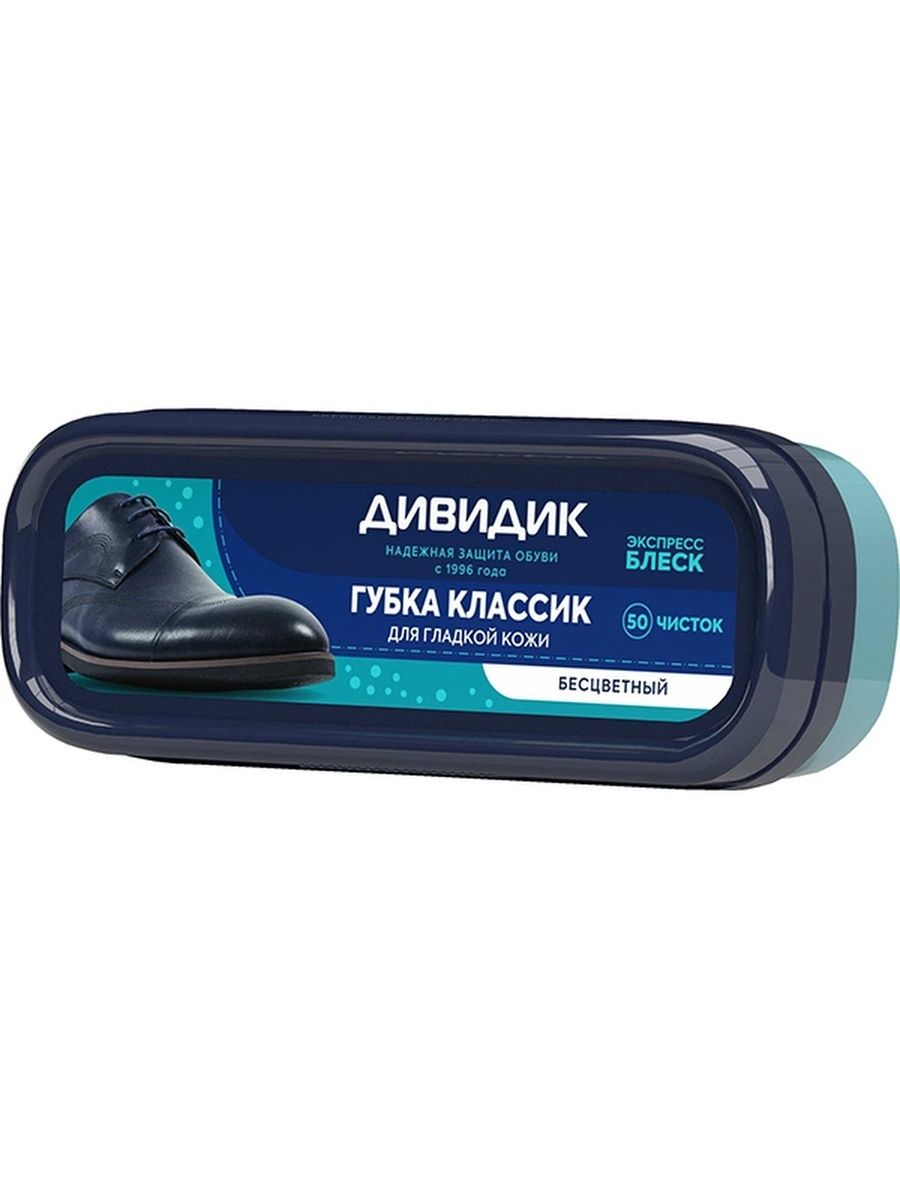 Губка для гладкой кожи Дивидик Классик бесцветная. Губка Дивидик очищает, обновляет цвет и придает естественный блеск изделиям из гладкой кожи. Обеспечивает до 50 качественных чисток! Бережно ухаживает за обувью, сохраняя ее первоначальный вид, придает обуви водоотталкивающий эффект. Пропитка в губке распределяется «точечным» образом в концентрированном виде. Нет жирности при первой чистке. Нет излишнего расхода вещества.