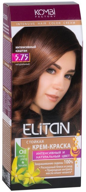Стойкая крем-краска, обладает интенсивным и натуральним цветом. На 100% закрашивает седину. Придаёт волосам роскошний блеск. Входящее в состав краски масло иланг-иланга питает, восстанавливает волосы. Способствует стойкому закреплению пигмента по всей глубине коркового слоя. Устраняет посеченность и шероховатость волоса, тем самым улучшая его оптические свойства (блеск). Стойкая крем-краска Элитан Intensive Hair Color Cream содержит новую технологию окрашивания Brilliant Shine c масом ylang-ylang. Фотоны интенсивно отражаются от каждой микрочастицы пигмента, формируя сияющий блеск и обеспечивая полную цветопередачу.