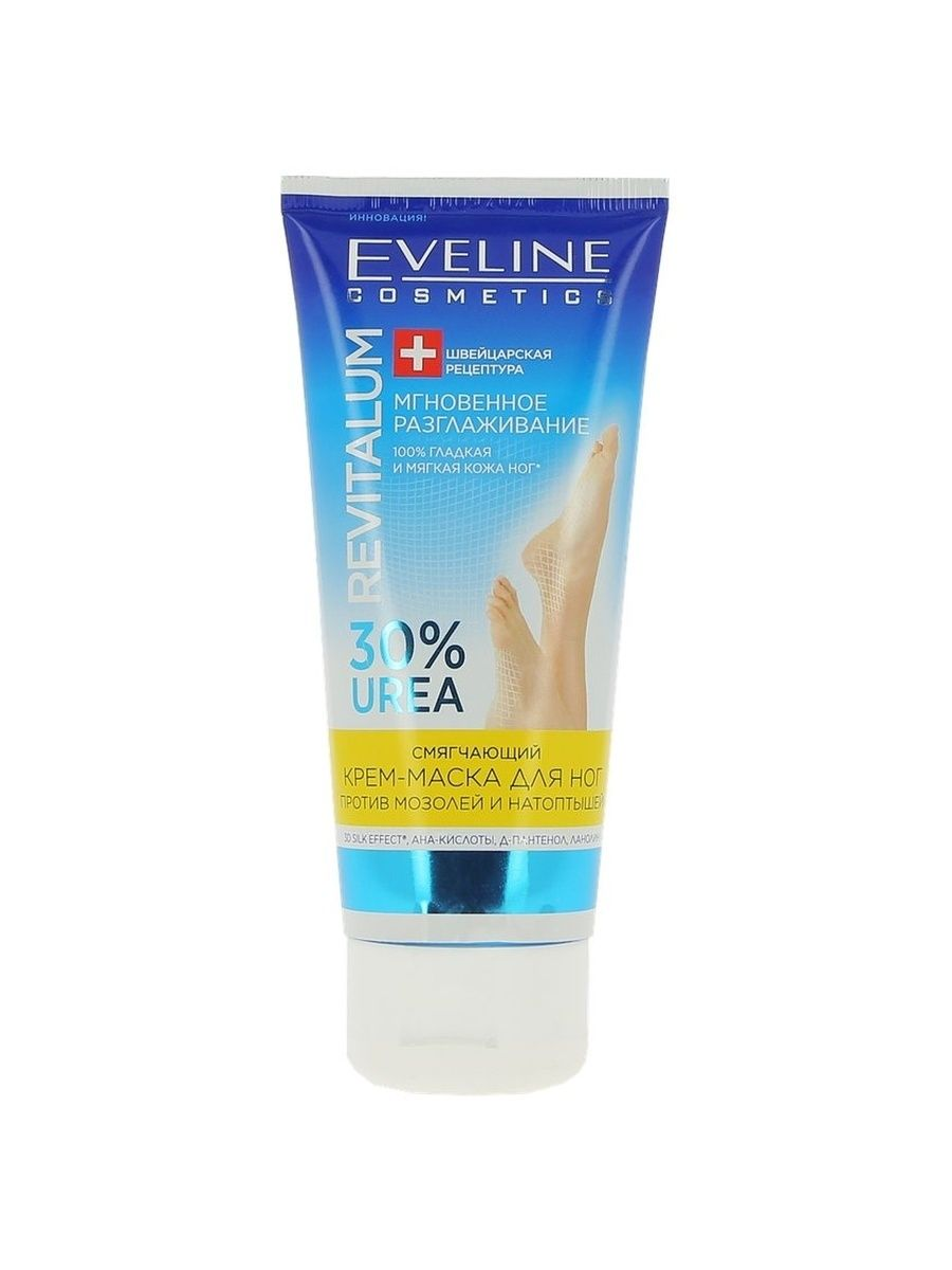 EVELINE Крем-маска для ног смягчающий против мозолей и натоптышей серии Revitalum 75 мл 3D SILK EFFECT® AHA-кислоты, Д-пантенол, Ланолин, 30% Urea, Мгновенное разглаживание, 100% гладкая и мягкая кожа ног, Швейцарская рецептура. Инновационная формула крема-маски, основанная на отшелушивающем действии AHA-кислот, концентрированном питательном 30% UREA и разглаживающем ланолине, эффективно борется с мозолями и натоптышами. Инновационная система 3D SILK EFFECT® действует как отшелушивающие носки в креме, эффективно удаляя сухой, огрубевший эпидермис и стимулируя цикл его возобновления. Благодаря содержанию Д-пантенола и липидов крем стимулирует регенерацию, восстанавливает гладкость и активно противодействует появлению пересушиваний и трещин. В результате кожа становится идеально мягкой, увлажненной и шелковисто гладкой, а регулярное применение крема предотвращает появление новых натоптышей и мозолей.