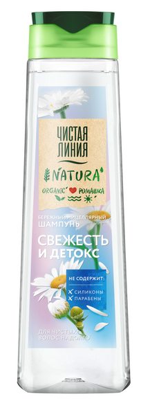 Для свежих и чистых волос надолго попробуйте очищающий мицеллярный шампунь NATURA СВЕЖЕСТЬ и ДЕТОКС. В шампуне ЧИСТАЯ ЛИНИЯ NATURA СВЕЖЕСТЬ И ДЕТОКС вся сила органической ромашки. Биологически активные вещества ромашки обладают антиоксидантными свойствами, бережно ухаживают за кожей головы, смягчают волосы и придают им здоровый блеск. Легкая формула без силиконов и парабенов обеспечивает полноценный детокс-уход. Волосы становятся более сильными и свежими. Без силиконов и парабенов.