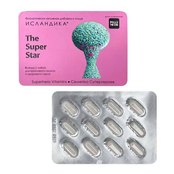 Биологически активная добавка к пище Pills To Go The Super Star. Рекомендуется в качестве дополнительного источника уроновых кислот.Исландский мох - мощный природный иммуномодулятор с регенерирующим и противовоспалительным действием.БАД к пище The Super Star улучшает функции дыхательной системы , успокаивает слизистые рта и глотки, помогает справиться с налетом и сухостью, помогает при осиплости и охриплости, возникающих из-за повышенных нагрузок на голосовые связки и сухости воздуха. Поддерживает легкое дыхание, красивый голос и здоровое горло.Суточная доза(4 таблетки) сожержит уроновых кислот - не менее 100 мг. Рекомендации по применению: взрослым по 1 таблетке 3-4 раза в день непосредственно после еды. Продолжительность приема - 2-3 недели. При необходимости прием можно повторить. Таблетки следует рассасывать, не разжевывая, до полного растворения.Противопоказания: индивидуальная непереносимость компонентов продукта, беременность, кормление грудью, нарушение углеводного обмена. Перед употреблением рекомендуется проконсультироваться с врачом.БАД не является лекарственным средством.
